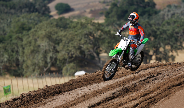 First off the chassis feels very light but still retains much of that traditional Kawasaki straight-line stability. For our test rider, we did slight adjustments to the handlebar but never felt the need to adjust the position of the bar mount forward or back, nor the footpegs, although they are both adjustable. The flatter and slightly narrower seat and shrouds give the new KX a lighter feel while riding, not to mention the slight weight saving overall. The new chassis feels more up to date with the light, slim, and quick-handling generation.