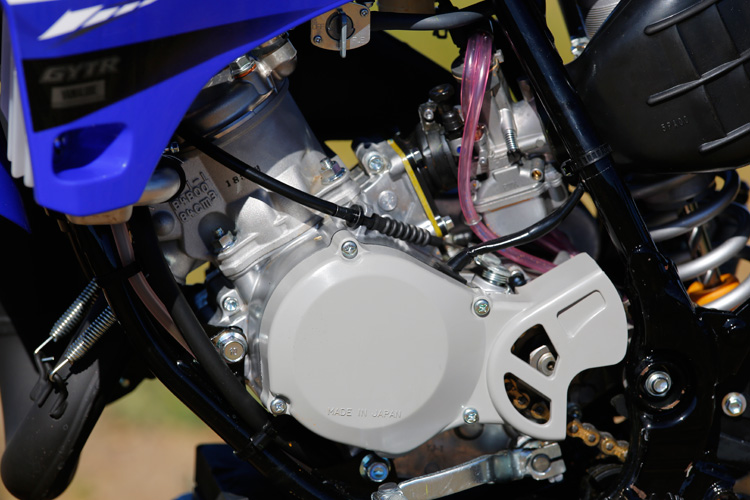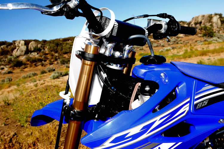 The YZ85 gets an all-new more powerful power-valve engine. At the track, from the get-go, we could tell this new motor is way better than the older model. It has gobs more bottom end and offers a way longer power curve. Yamaha claims that at a certain RPM range, there is a 50-percent increase in performance. The transmission has also been beefed up to take on the added horsepower. The cylinder has new porting specs, a CDI unit, and an exhaust all which help put the icing on the cake. The suspension has been updated to match the added power (36mm coil spring adjustable fork up front) and the swingarm and link is all-new as well. The front brake is more powerful and has updated an brake line routing like its larger YZ siblings. Yamaha also added more adjustability with the four different handlebar positions to pick from. One of our test riders took advantage of this option since he is a taller 85 rider.