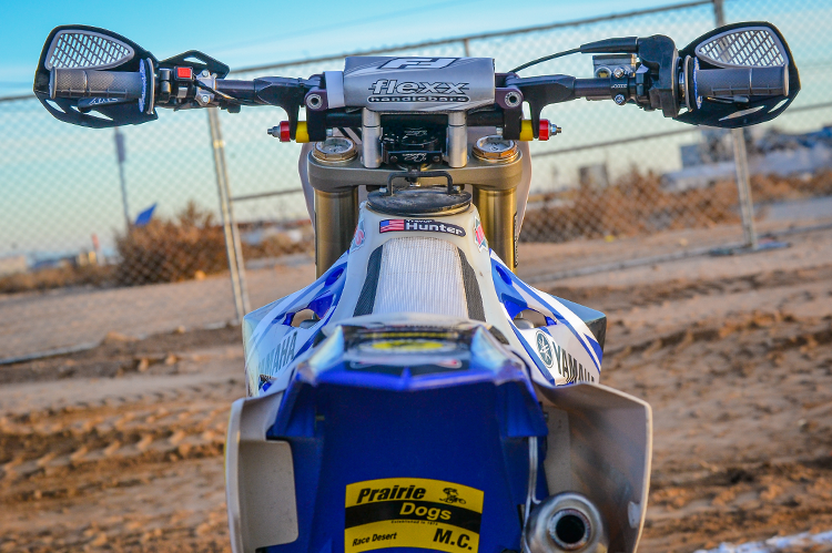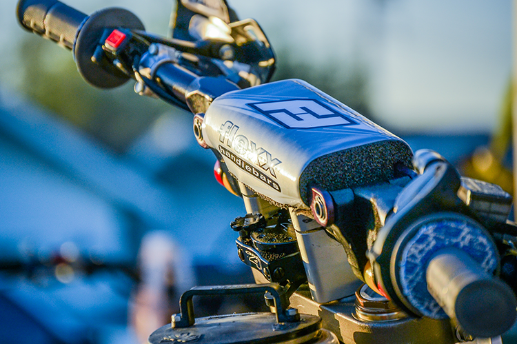 Next, the traditional off-road necessities include an Zip Ty IMS 3.2 Gallon Tank, GPR Stabilizer, TM Designworks Skid Plate, and Fasst Co. Flexx Handlebars. We went to our traditional GPR Stabilizer/Fasst Co. Flexx Handlebar setup as its been on our bikes for years and offers the comfort we’re looking for to minimize fatigue in the long races. AM’E Grips provide a soft contact point for our hands and eliminate unwanted blisters. ARC’s memlon levers bend and fold under impact but always return to their original shape making them an easy add-on when trying to minimize costly breaks.
