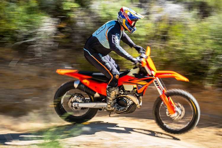The engine on KTM’s big-bore off-road racer is easily a stand-out trait. There is so much power on tap and it’s delivered in direct correlation with your right wrist. There’s a healthy bottom end at the opening of the throttle and the power steadily climbs in linear fashion through the mid-range and into the top end where the power climbs quite far for a 450cc off-road bike. Something KTM has improved over the years is they’ve reduced low RPM flameouts in slow speed, technical terrain. It still isn’t on par with a bike like the 450 XC-W, but for a cross-country race bike, it’s adequate and gets the job done.