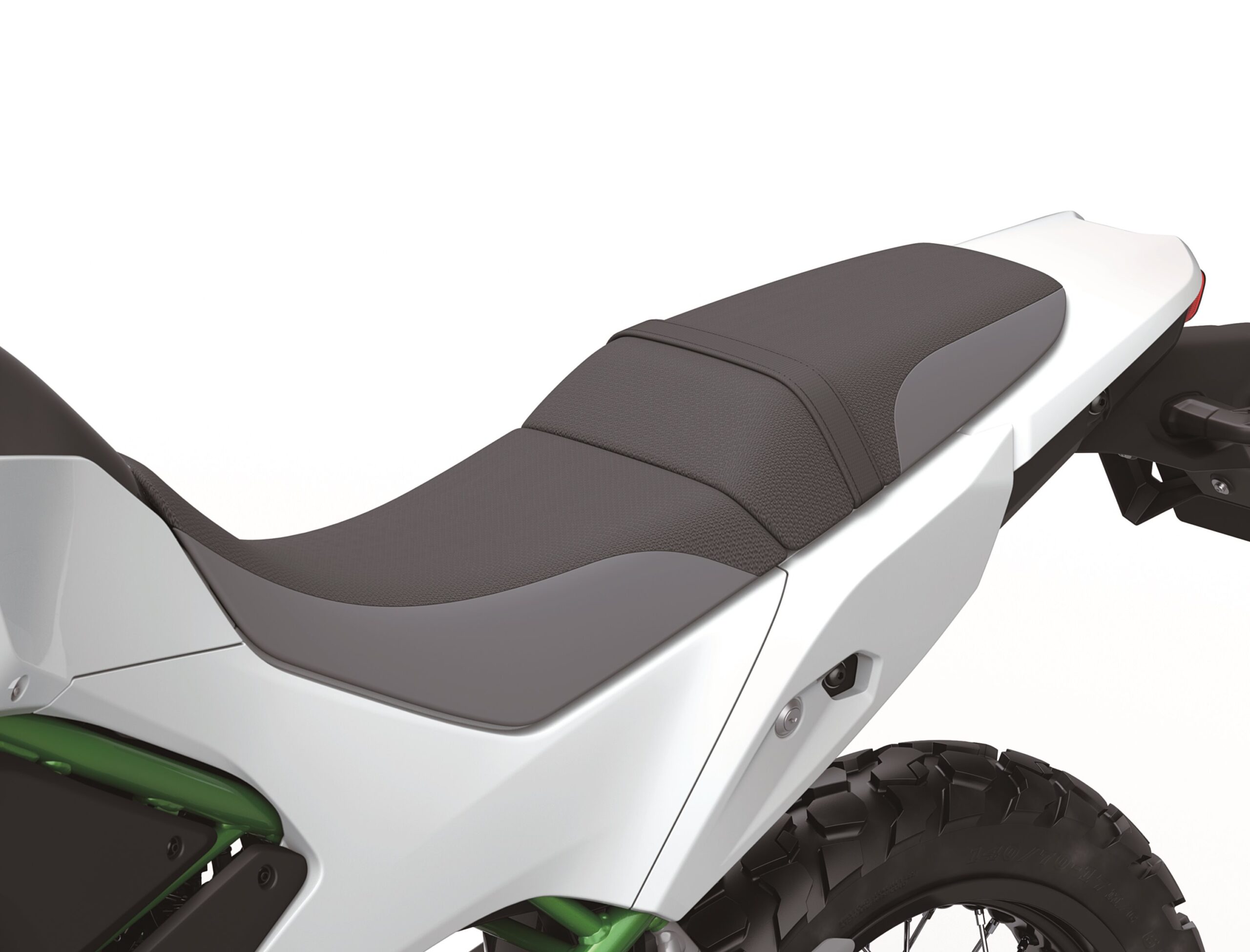 Seat design enhances both comfort and control. The 33.8” seat height balances a relaxed knee bend with reachable footing, while its stepped arrangement provides lumbar support and a higher vantage point for the pillion passenger. Unique hollow cushioning offers long-ride comfort and style, making the KLE500 ideal for adventure touring. The rider’s seat shape also allows easy forward and rearward weight shifting, optimizing bike handling during off-road maneuvers. Adding versatility, the footpegs feature removable rubber inserts, enabling a choice between road-friendly cushioning or spiked, off-road grip without the need for tools.