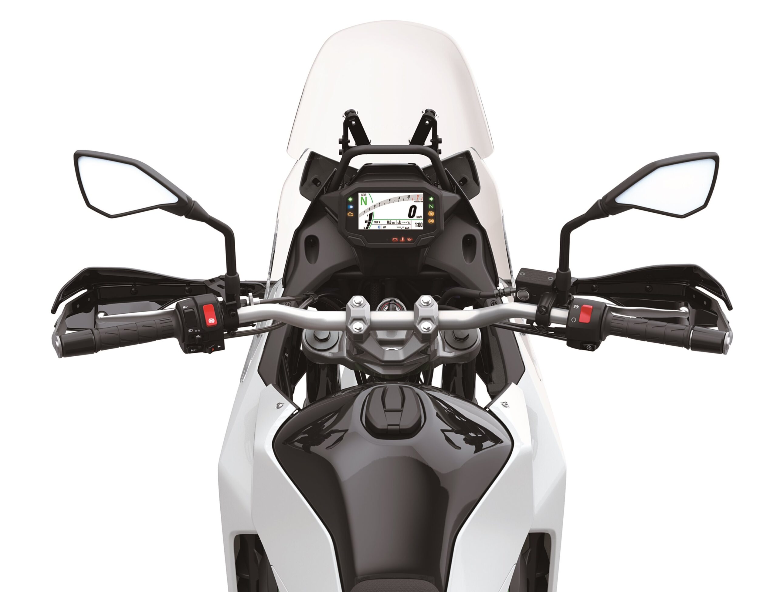 Rally-inspired features round out the ergonomics package. A tall, adjustable windshield offers three height positions – standard, 27mm higher, and 55mm higher – while maintaining a consistent contour and visual style. Clear panels surrounding the front cowling provide excellent visibility of the terrain and block wind effectively, evoking authentic rally machines. Together, these details combine to create a riding position that balances comfort, control, and style, giving riders confidence on both pavement and dirt.